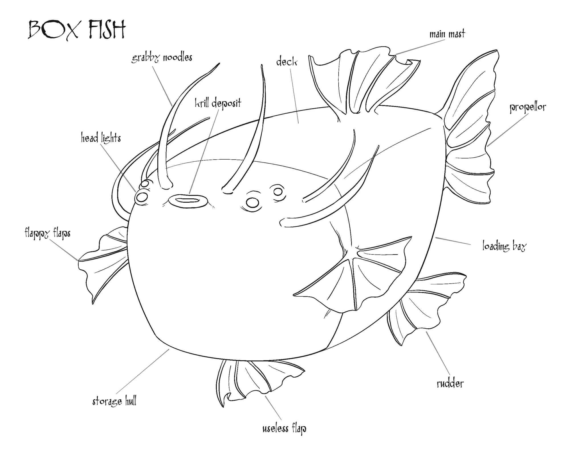 Box Fish are not as big as whales, but do come close in some cases. About ten feet high, six feet wide, and anywhere from 10 to 40 feet long, they have a squarish shape, nibble on sky krill, which they look for with four to five tiny little eyes, and an array of tendrils which are like a nostril turned inside out, which then deposit the krill into a very small mouth near the top. No one is sure how they float about the skies, as their skin is very tough, and there is little meat or fat on them to speak of. The name comes from their enormous box shaped skeleton, which holds a large empty compartment on the inside accessible through the very large anus. They can be trained and are sometimes used to ship goods from one place to another.