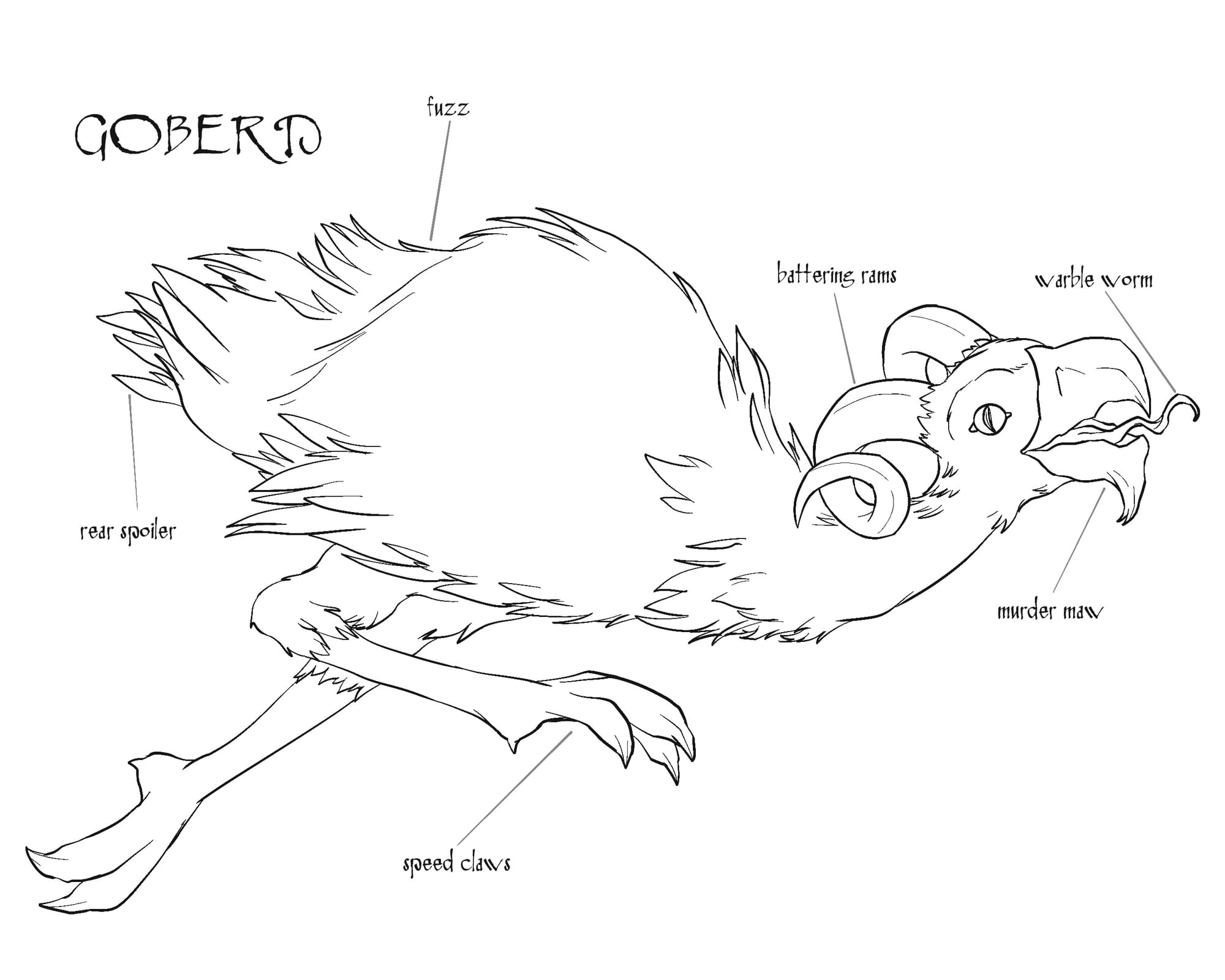 The Goberd, or sometimes pronounced “gobert”, “gibird”, or “gbrt”, is a flightless hairy bird with horns, about as tall as a man, with powerful legs, able to bear a modest load or pull a cart, and has a penchant for eating anything, often snails and slugs, sometimes munching on tin cans with its short beak. It’s cry is a warbling “mahhh!” like a billy goat, whatever that is, with its long tongue waggling about. You can ride them like an Ostrix, but they do not like it, and only will do it with the best of animal handling. They are placed in long trains to pull caravans, sometimes as many as 50, to assist the Brute Ox train, but mainly are there for protection, in the case of attack by daghorns or even larger beasts. If a caravan is attacked and the guards are unable to repel the predators, the Goberds will be released in a last ditch effort to draw the predators away from the caravan. On such trips the goberds are lovingly called “the lambs”.