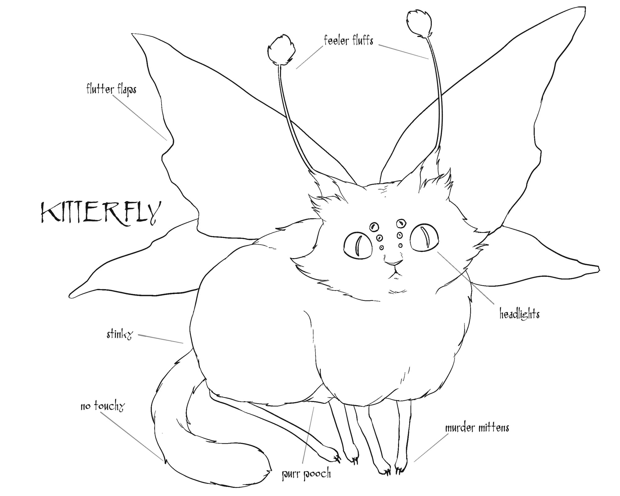 A Kitterfly is a very small colorful cat, no bigger than your hand, with butterfly wings. It has very small paws with long hind limbs, and wisps of hair like antennae that sprout from the tips of their ears. They have two large eyes, and then a line of smaller eyes down each side of the bridge of the nose, which are less noticeable. They prey on other small insects and beetles, and are often kept as pets by jungle denizens. They also have the ability to warn of a Fihrblix by hissing in its direction. Kitterfly’s are also a choice meal of the Fihrblix. Kitterflies colors are of a near infinite variety.
